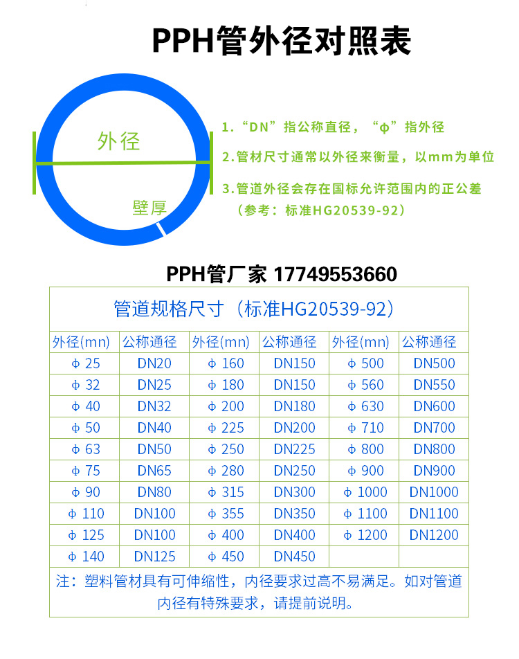 De是管道外壁的直径,是塑料管道(如PPH、PPR、PE管)的核心标注参数。根据ISO 15874标准,β晶型PPH管的De与DN存在固定对应关系,例如江苏润和PPH管:
